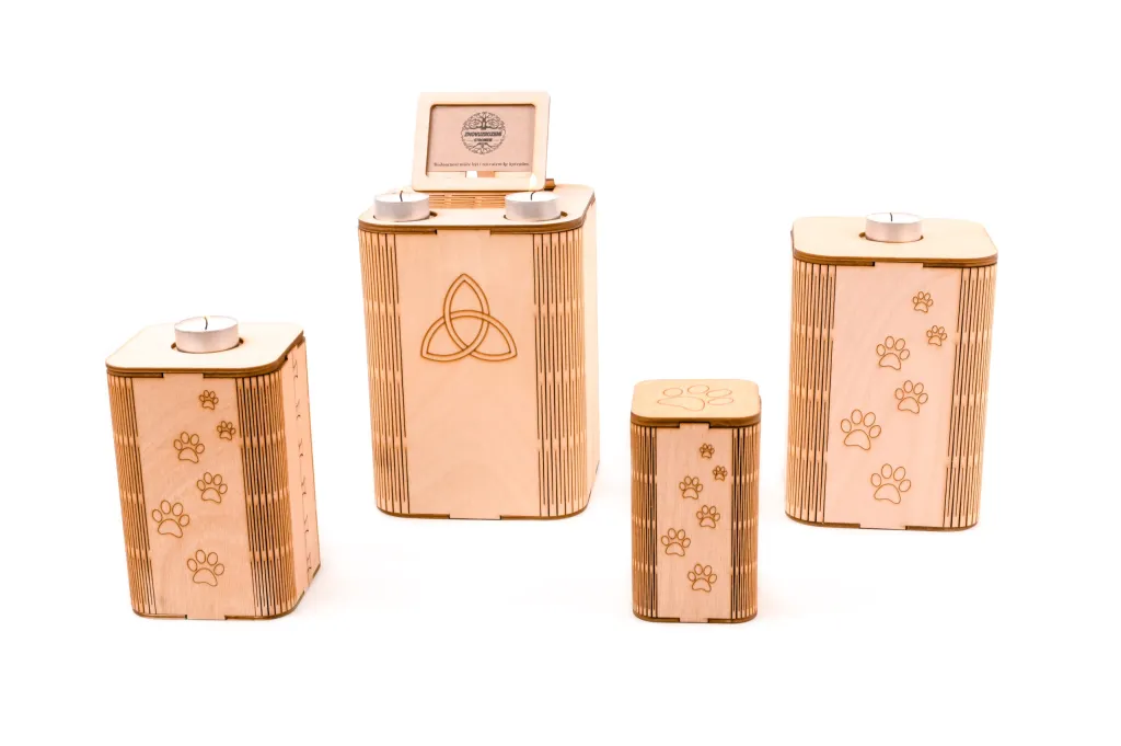 Verze pro zvířecí mazlíčky je ozdobena zvířecími packami, které stoupají vzhůru k věčnosti. Víčko u velikostí L a M, které Vám i po vysazení stromu zůstává, je opatřeno rámečkem na fotografii pro zachování pietní vzpomínky.